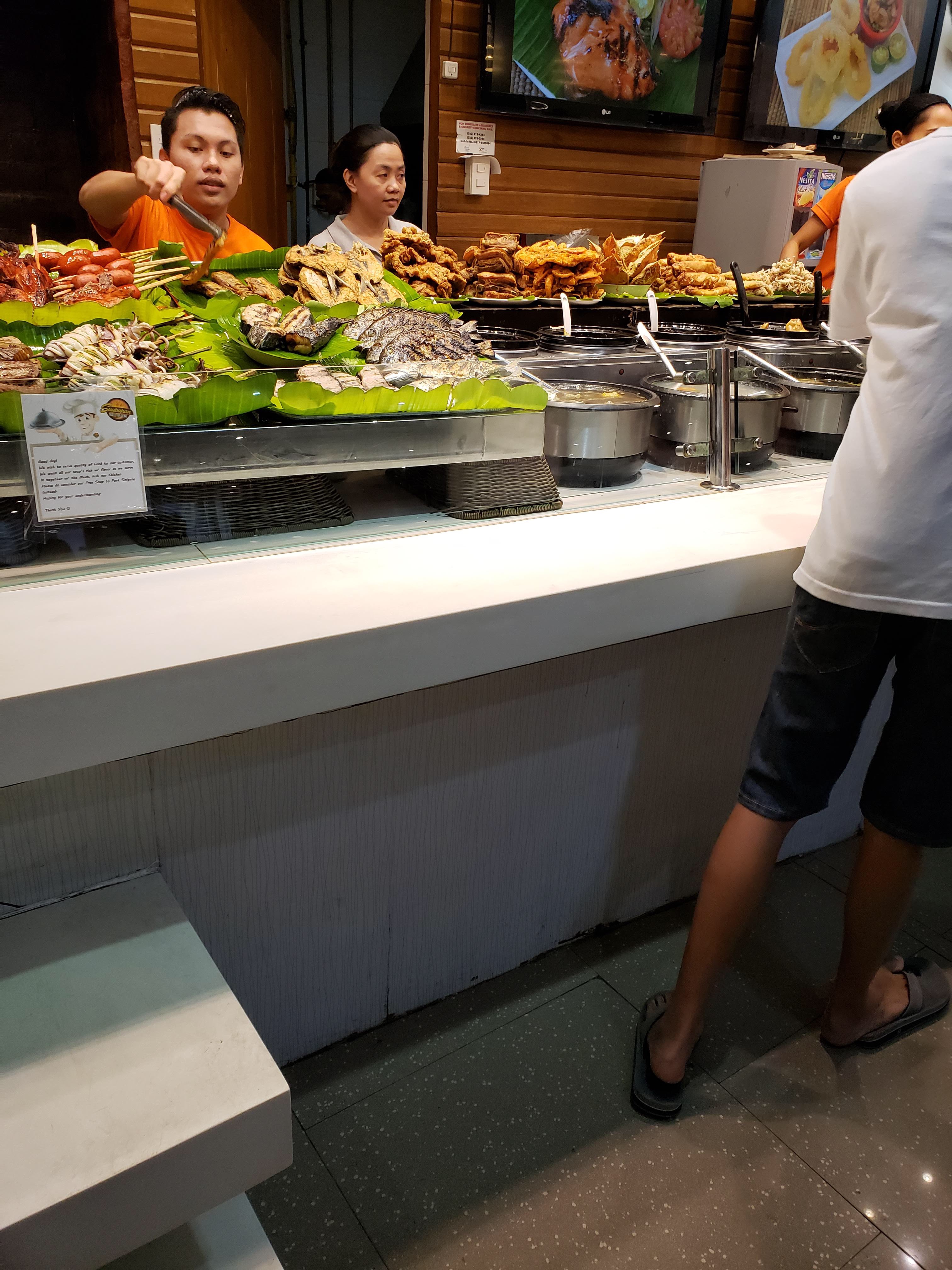 The pictures here gives you an idea of the variety of food at each stall. The stalls stretch along the length of the court and customers can choose from different vendors based on what you are looking for. Each vendor collects payment at their stall. Did I mention the food is quite reasonable you can get a lot for ten dollars. Food included pork, chicken, seafood, beef, rice, lumpia etc. It should be noted pork was prepared in different styles so was the fish, crabs and scallops and more. Meals always include some soup despite the warm weather. Returned to the hotel after taking my pictures since I wasn’t doing any shopping.